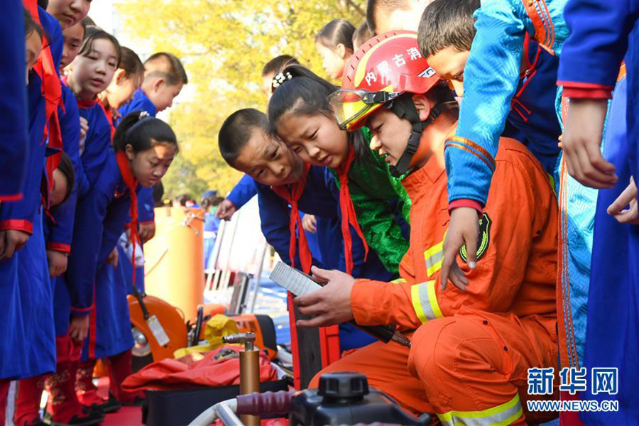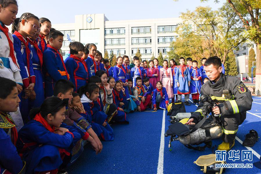 1/011月4日,內(nèi)蒙古消防救援總隊(duì)指戰(zhàn)員為學(xué)生們講解消防裝備的使用方法。(新華社記者 彭源/攝)