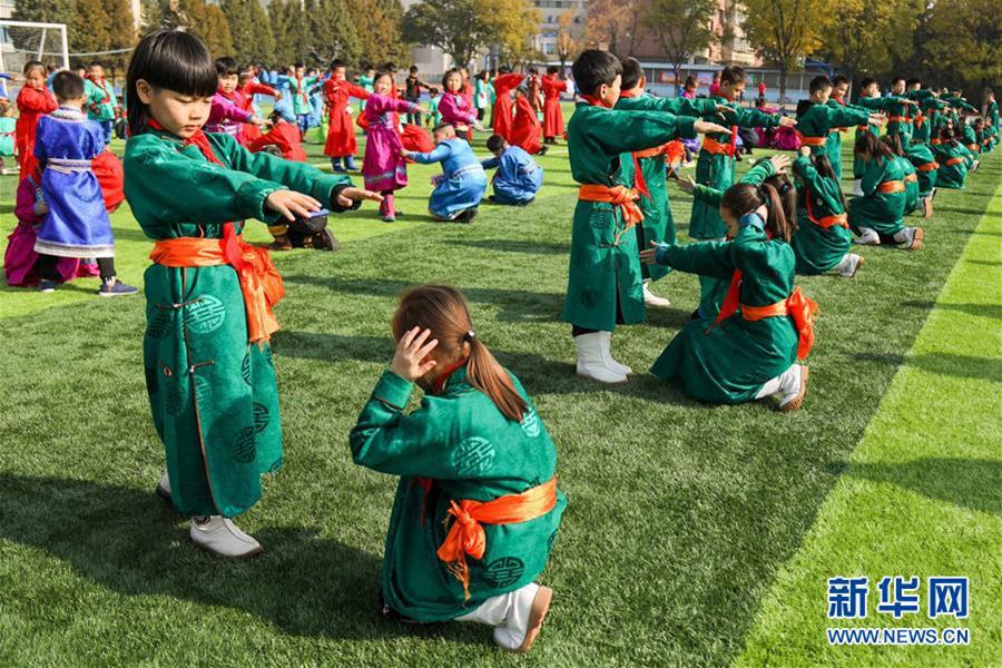 1/011月4日,呼和浩特市蒙古族學(xué)校的學(xué)生表演疏散逃生操。(新華社記者 彭源/攝)