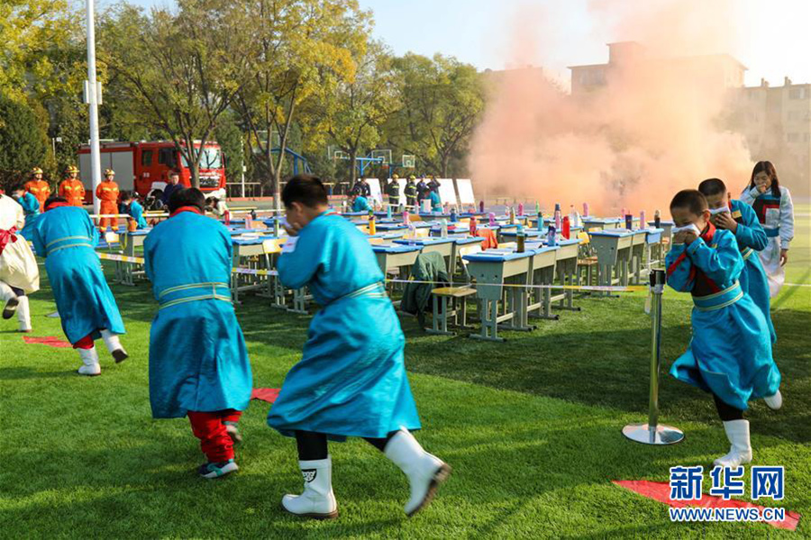 1/011月4日,呼和浩特市蒙古族學(xué)校的學(xué)生進(jìn)行疏散逃生演練。(新華社記者 彭源/攝)