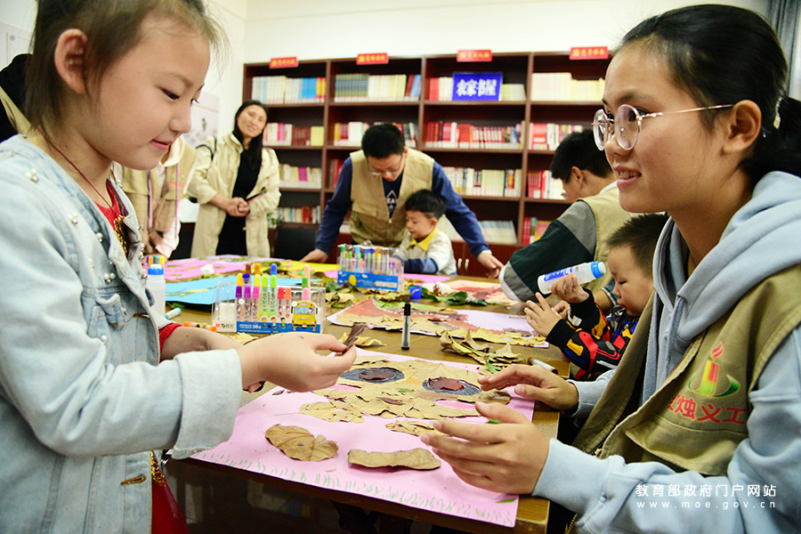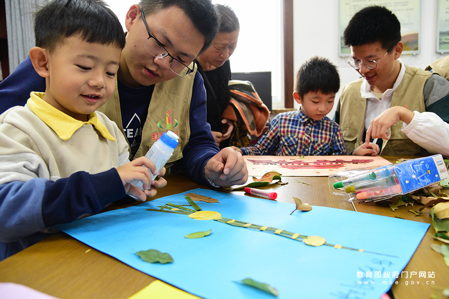 江蘇科技大學志愿者在指導小朋友用落葉拼貼創(chuàng)意環(huán)保畫。(石玉成/攝)