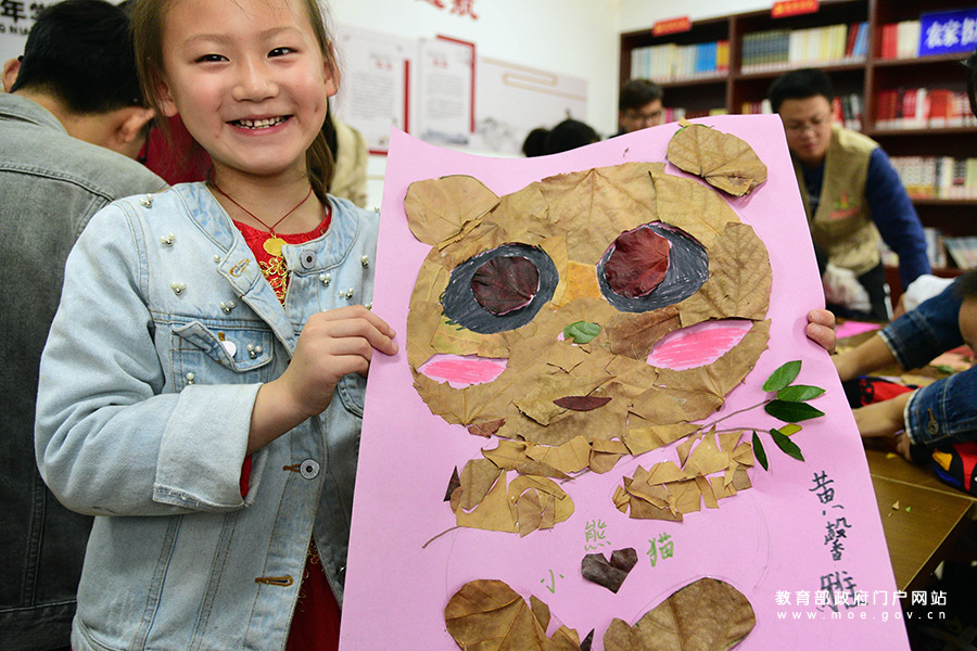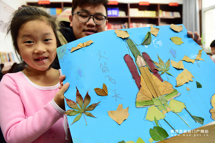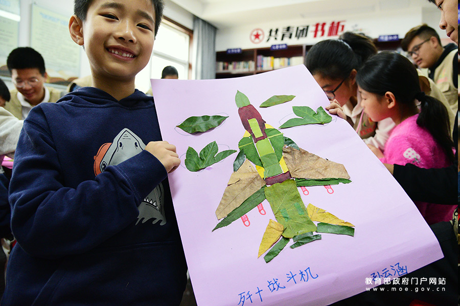小朋友展示用落葉拼貼制作的創(chuàng)意環(huán)保畫。(石玉成/攝)