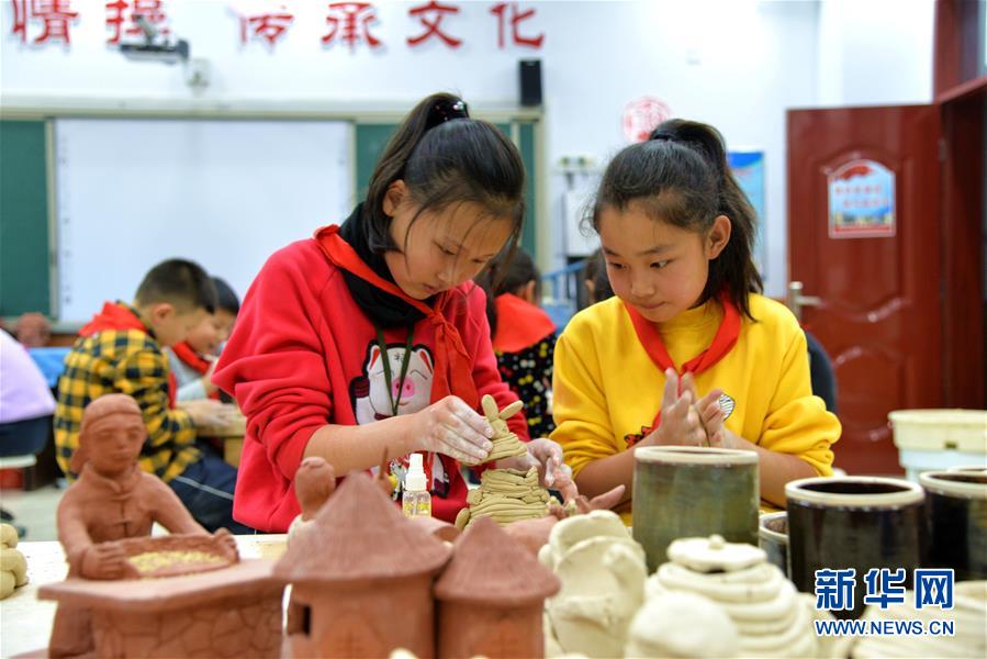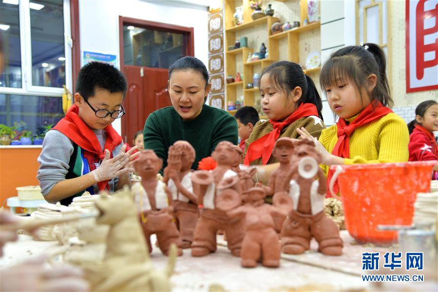 1/012月16日,清水河縣城關(guān)鎮(zhèn)第一小學(xué)學(xué)生在老師的指導(dǎo)下制作陶器。(新華社記者 徐欽/攝)