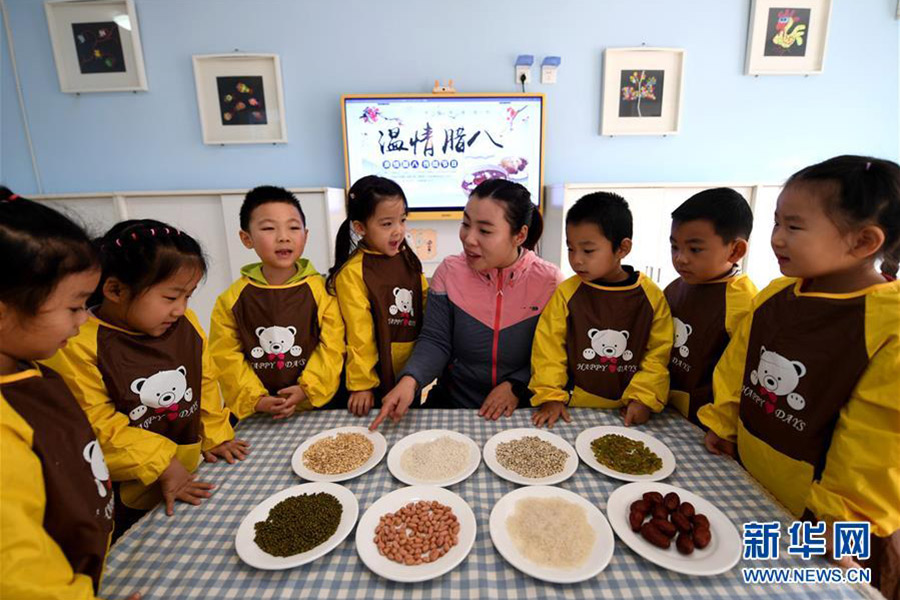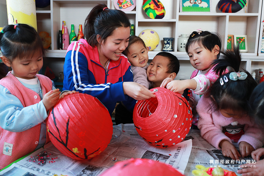 承德市雙灤區(qū)第三幼兒園的老師指導(dǎo)孩子們做迎新年手工作品“大紅燈籠”。(楊樹鳳、張學(xué)軍/攝)