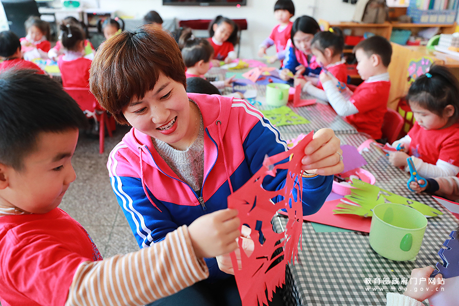 “老師,您看看我剪的窗花怎么樣!”,承德市雙灤區(qū)第三幼兒園的老師指導(dǎo)孩子們剪窗花。(楊樹鳳、張學(xué)軍/攝)