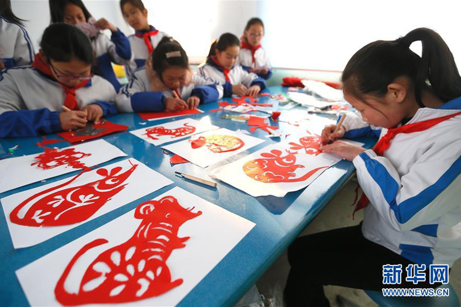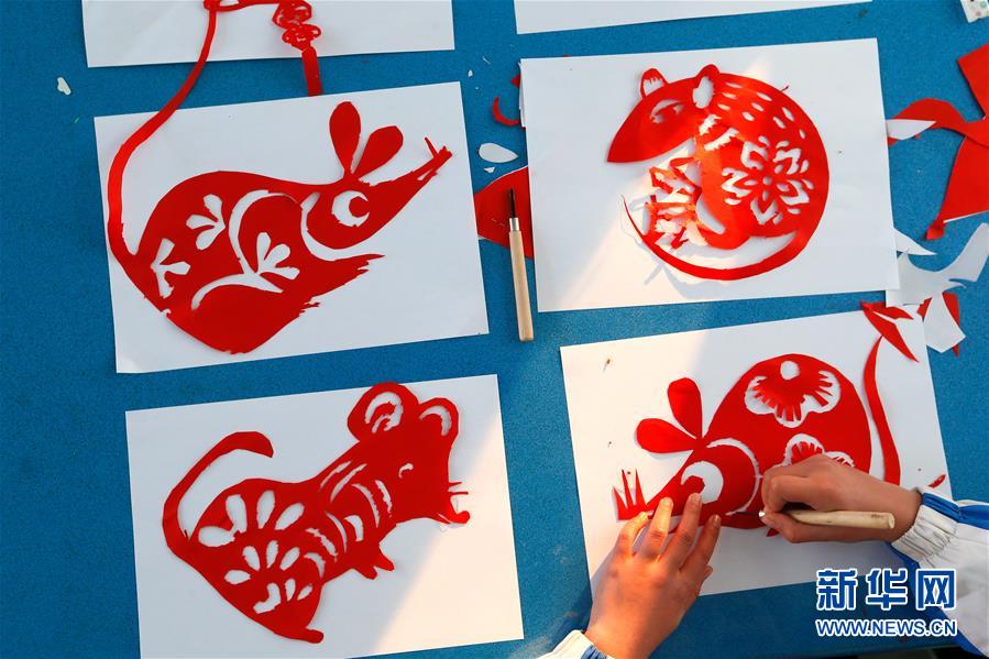 1/01月13日,山東青島即墨區(qū)藍(lán)谷高新區(qū)東皋埠小學(xué)“剪紙社團(tuán)”的學(xué)生在創(chuàng)作鼠題材的紙藝作品。(新華社發(fā) 梁孝鵬/攝)