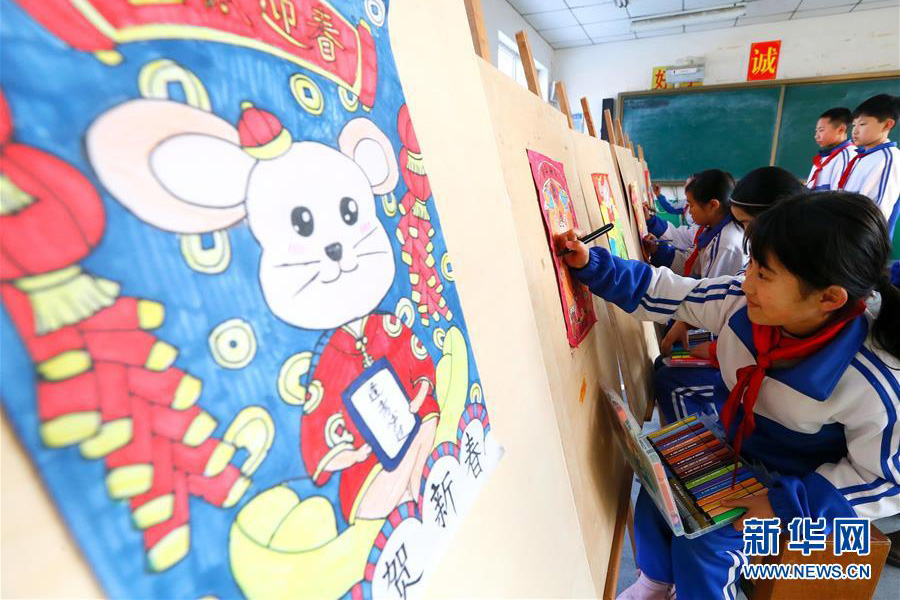 1/01月13日,山東青島即墨區(qū)藍(lán)谷高新區(qū)東皋埠小學(xué)“彩畫社團(tuán)”的學(xué)生在創(chuàng)作鼠題材的彩筆畫。(新華社發(fā) 梁孝鵬/攝)