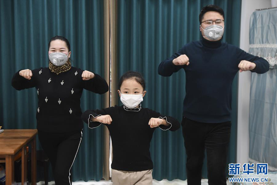 1/02月6日,重慶市云陽縣海峽小學(xué)一年級(jí)學(xué)生周彥希和爸爸媽媽一起在家中做廣播體操。(新華社記者 王全超/攝)