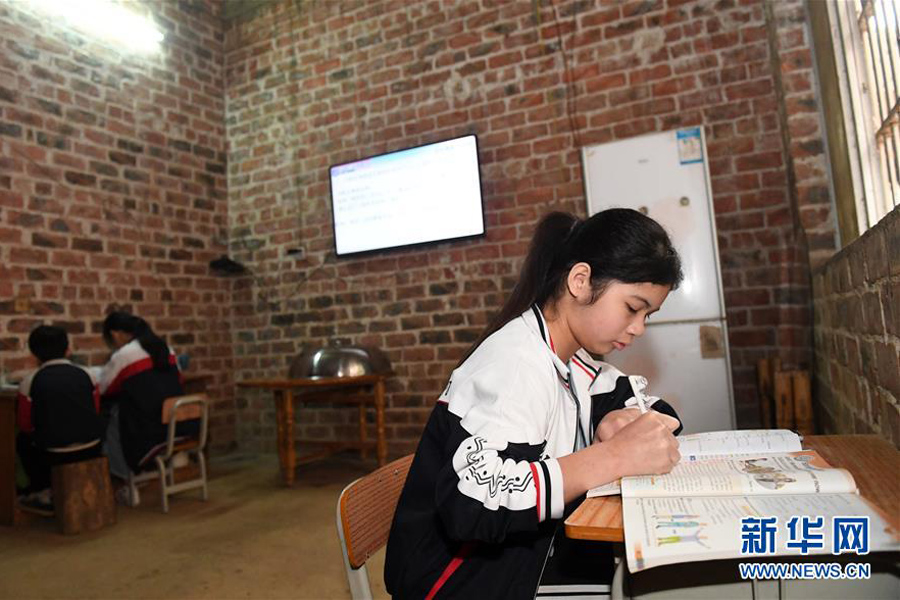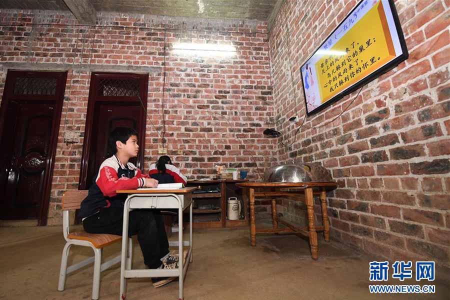 1/03月12日,在廣西南寧市武鳴區(qū)太平鎮(zhèn)慶樂村幸福屯,貧困家庭學(xué)生黃迪徽在家中通過電視學(xué)習(xí)“空中課堂”課程。(新華社記者 陸波岸/攝)