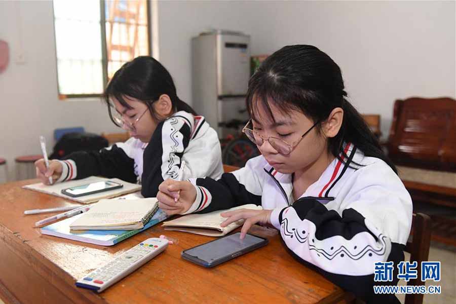 1/03月12日,在廣西南寧市武鳴區(qū)太平鎮(zhèn)慶樂村顯昌屯,貧困家庭學(xué)生黃捷(右)、黃敏在家中通過手機播放“空中課堂”課程。(新華社記者 陸波岸/攝)