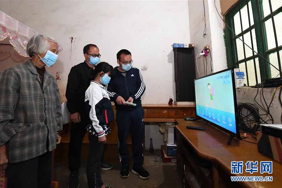 1/03月12日,在廣西南寧市武鳴區(qū)太平鎮(zhèn)慶樂村幸福屯,貧困家庭學(xué)生黃迪徽在跟著“空中課堂”做眼保健操。廣西南寧市武鳴區(qū)在實施“空中課堂”工作中,針對部分建檔立卡貧困家庭因缺設(shè)備、無網(wǎng)絡(luò)等原因無法正常參加網(wǎng)上在線學(xué)習(xí),由幫扶單位及幫扶責(zé)任人負責(zé)統(tǒng)籌解決,提供智能手機、電視、機頂盒等設(shè)備,并上門指導(dǎo)安裝服務(wù),確保學(xué)生正常參加在線學(xué)習(xí)。目前,武鳴區(qū)“空中課堂”已覆蓋建檔立卡貧困家庭學(xué)生。(新華社記者 陸波岸/攝)