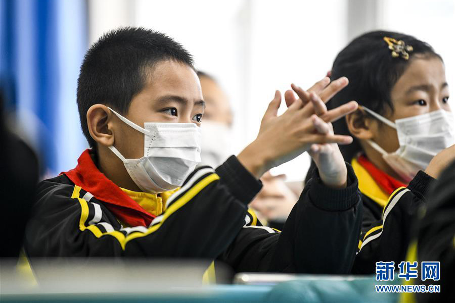 1/03月23日,在位于烏魯木齊的新疆教育學(xué)院實(shí)驗(yàn)小學(xué)二年級(jí)2班,學(xué)生們跟老師學(xué)習(xí)“七步洗手法”。(新華社記者 王菲/攝)