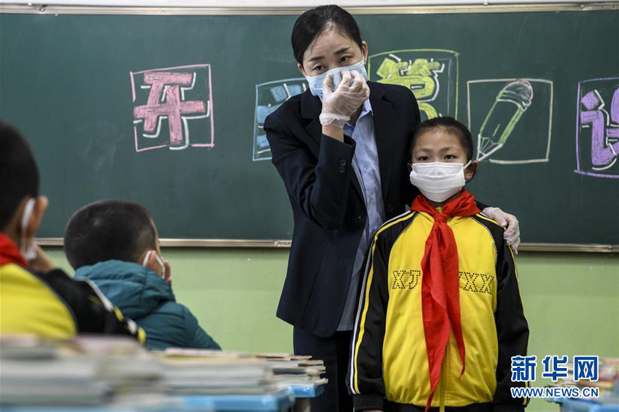 1/03月23日,在位于烏魯木齊的新疆教育學(xué)院實(shí)驗(yàn)小學(xué)二年級(jí)2班,老師為剛剛進(jìn)班的學(xué)生測(cè)量體溫。 隨著新冠肺炎疫情防控形勢(shì)持續(xù)向好,繼3月16日初三、高三和中職畢業(yè)年級(jí)學(xué)生首批開(kāi)學(xué)后,新疆(含新疆生產(chǎn)建設(shè)兵團(tuán))5004所中小學(xué)和中職學(xué)校的436.79萬(wàn)學(xué)生23日全面開(kāi)學(xué)。在各校“開(kāi)學(xué)第一課”上,老師為學(xué)生們?cè)敿?xì)講解校園消毒防疫知識(shí)、個(gè)人衛(wèi)生防范等內(nèi)容。(新華社記者 王菲/攝)