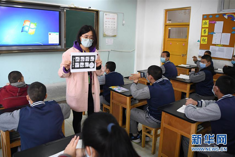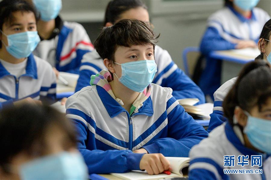 1/03月23日,新疆伊犁哈薩克自治州霍城縣瞻德中學(xué)學(xué)生在上開(kāi)學(xué)第一課,老師為學(xué)生講解防疫知識(shí)。(新華社記者 沙達(dá)提/攝)