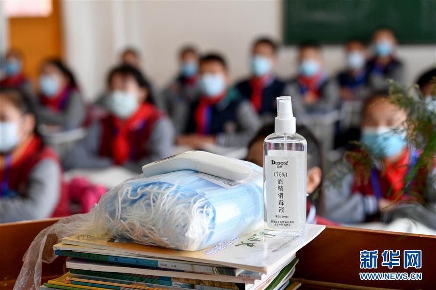 1/03月23日,新疆伊犁哈薩克自治州霍城縣瞻德中學(xué)教室里,講臺(tái)上擺放著口罩、酒精消毒液等物品。(新華社記者 沙達(dá)提/攝)