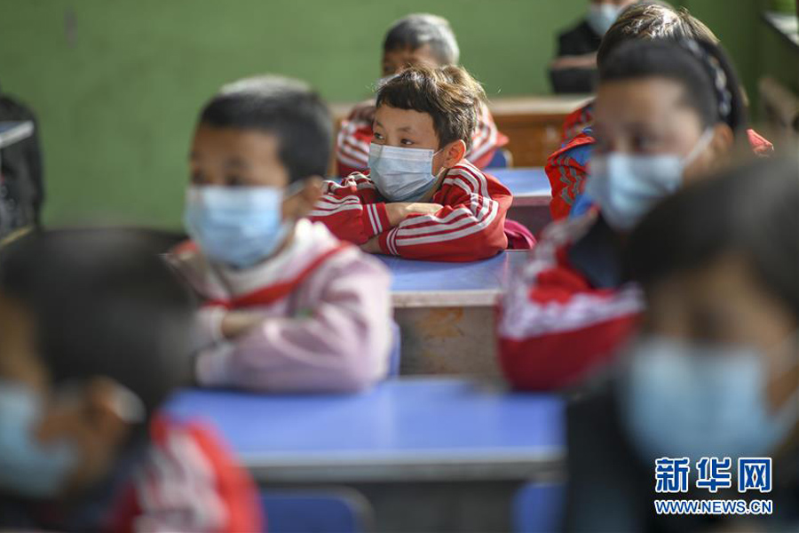 1/03月23日,在新疆和田地區(qū)墨玉縣阿克薩拉依鄉(xiāng)烏尊艾日克小學(xué)里,一年級(jí)的學(xué)生在學(xué)習(xí)防疫知識(shí)。 (新華社記者 趙戈/攝)