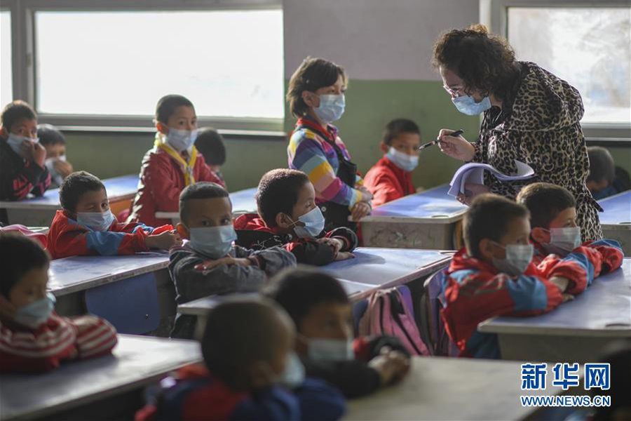 1/03月23日,在新疆和田地區(qū)墨玉縣阿克薩拉依鄉(xiāng)烏尊艾日克小學(xué)里,四年級(jí)的老師在給學(xué)生教授防疫知識(shí)。(新華社記者 趙戈/攝)