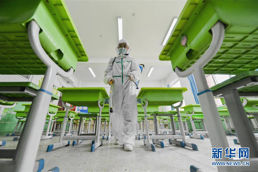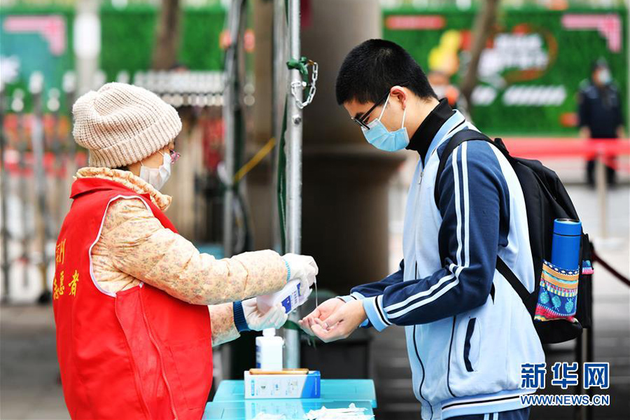 1/04月7日,福州屏東中學(xué)的高三年級學(xué)生在校門口進(jìn)行雙手消毒。(新華社記者 魏培全/攝)