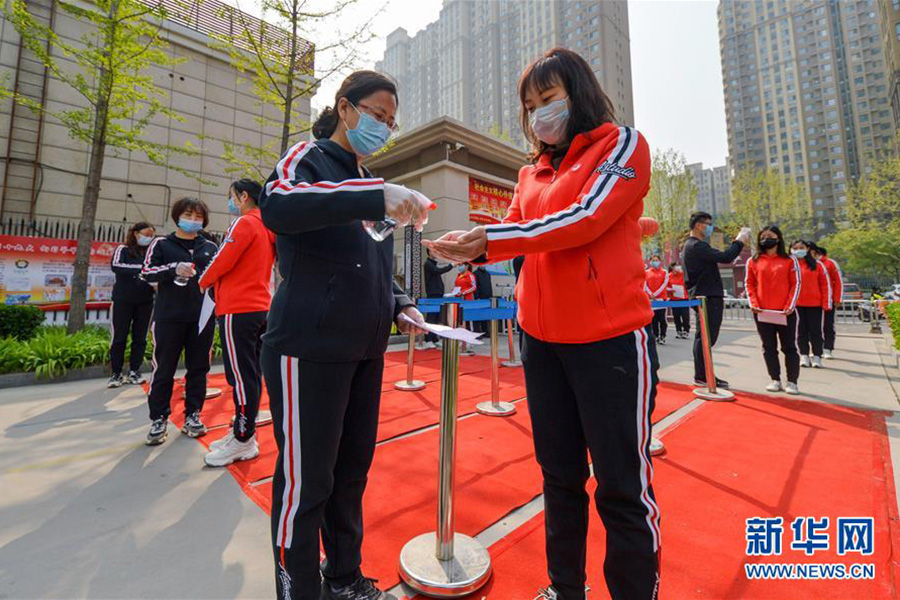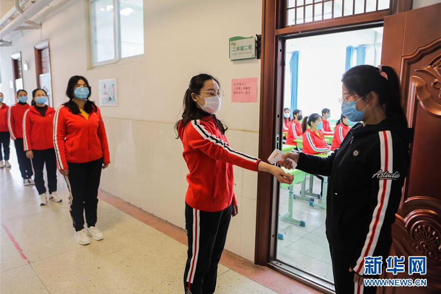 1/04月7日,邯鄲市邯山區(qū)趙王小學(xué)教師在演練中模擬學(xué)生接受體溫測量。(新華社記者 王曉/攝)