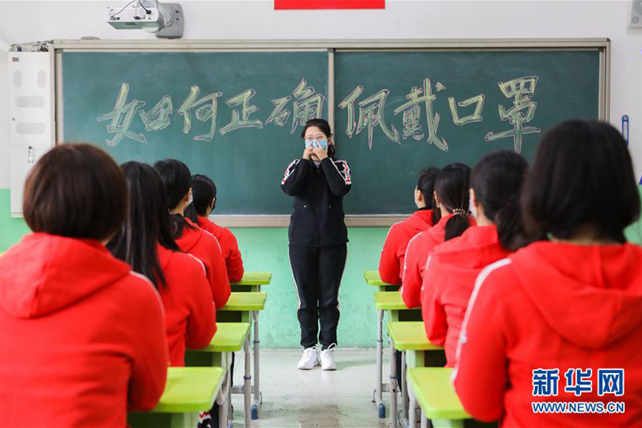 1/04月7日,邯鄲市邯山區(qū)趙王小學(xué)教師在演練講解口罩的正確佩戴方法。(新華社記者 王曉/攝)