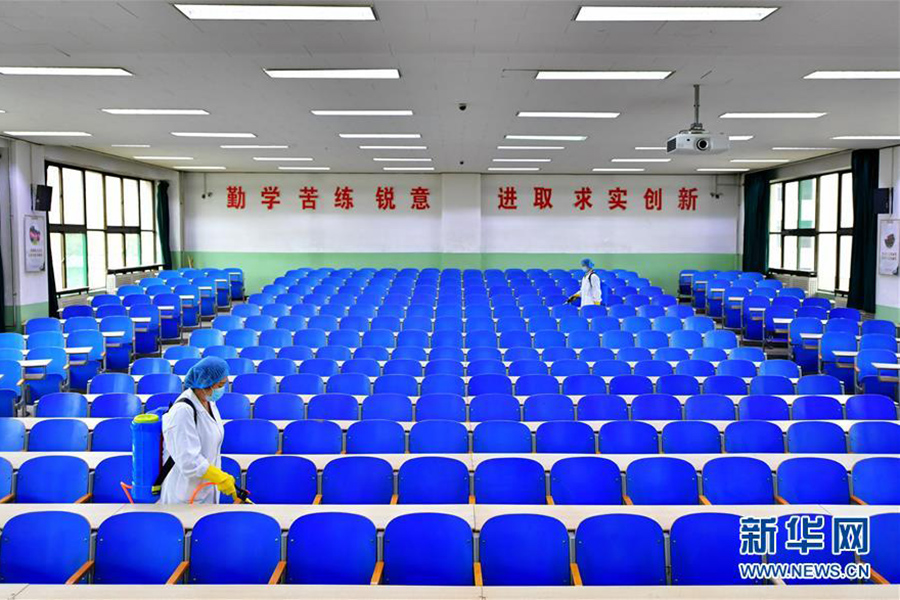 1/04月7日,湖南省永州市零陵區(qū)柳子中學(xué)的學(xué)生進(jìn)入食堂前消毒。(新華社發(fā) 潘愛民/攝)