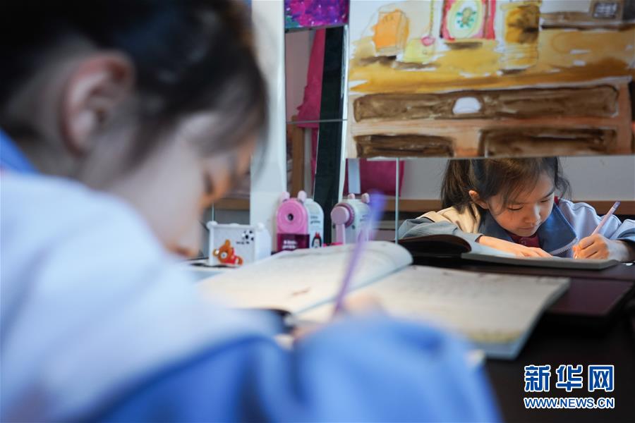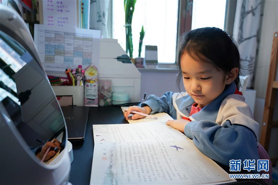1/04月13日,北京市朝陽師范學(xué)校附屬小學(xué)(西壩河校區(qū))三年級學(xué)生馬紫涵在家中按照新學(xué)期課表預(yù)習(xí)語文課程。(新華社記者 鞠煥宗/攝)