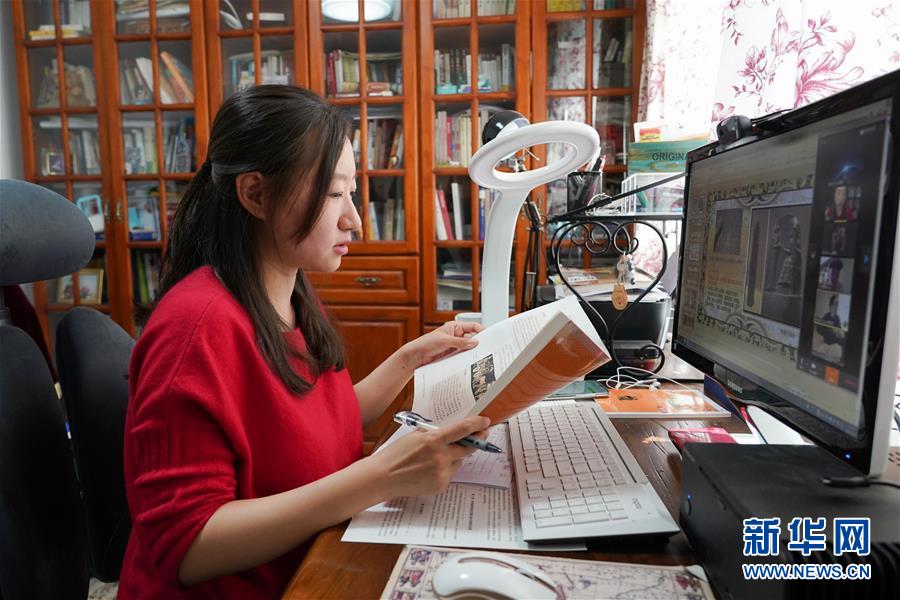 1/04月13日,人大附中西山學(xué)校高一歷史老師李響在家中為學(xué)生上課。(新華社記者 鞠煥宗/攝)