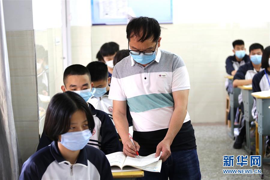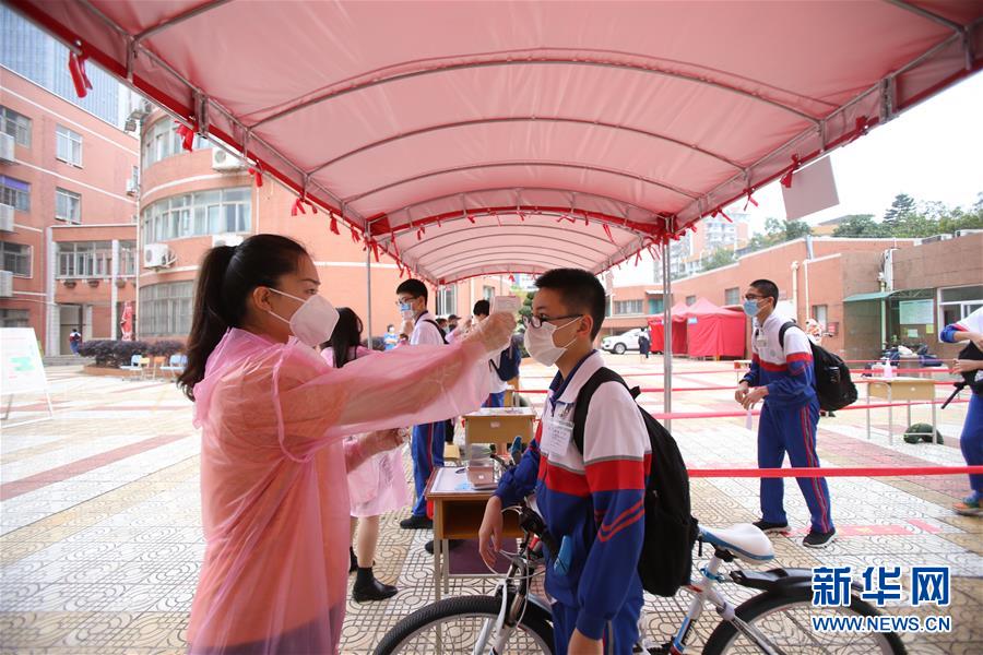 1/04月20日,在廈門松柏中學(xué)初中部,初三年級學(xué)生接受體溫測量。(新華社發(fā) 曾德猛/攝)