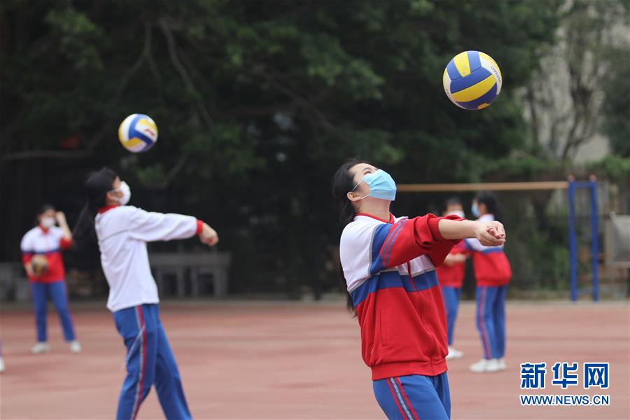 1/04月20日,在廈門松柏中學(xué)初中部,初三年級學(xué)生在體育課上打排球。(新華社發(fā) 曾德猛/攝)