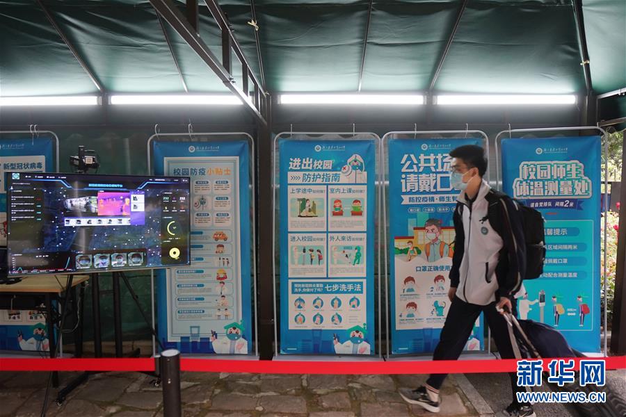 1/05月6日,在湖北省武昌實(shí)驗(yàn)中學(xué),一名高三年級(jí)的學(xué)生通過(guò)疫情防控監(jiān)測(cè)點(diǎn),經(jīng)過(guò)紅外測(cè)溫后進(jìn)入校園。(新華社記者 熊琦/攝)