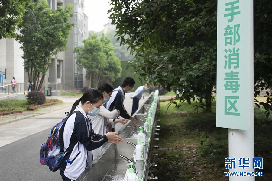 1/05月6日,在湖北省武昌實(shí)驗(yàn)中學(xué),高三年級(jí)的學(xué)生入校后在手部消毒區(qū)洗手。(新華社記者 熊琦/攝)