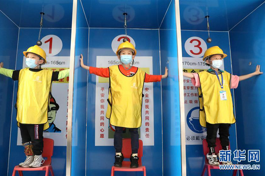 1/05月11日,在石家莊公共安全體驗(yàn)館,小朋友在進(jìn)行安全帽撞擊體驗(yàn)。(新華社發(fā) 梁子棟/攝)