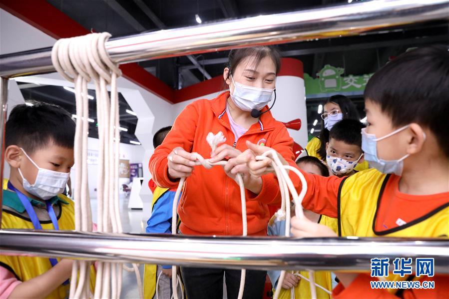 1/05月11日,在河北省石家莊公共安全體驗(yàn)館,講解員為小朋友講解系逃生安全繩的方法。(新華社發(fā) 梁子棟/攝)