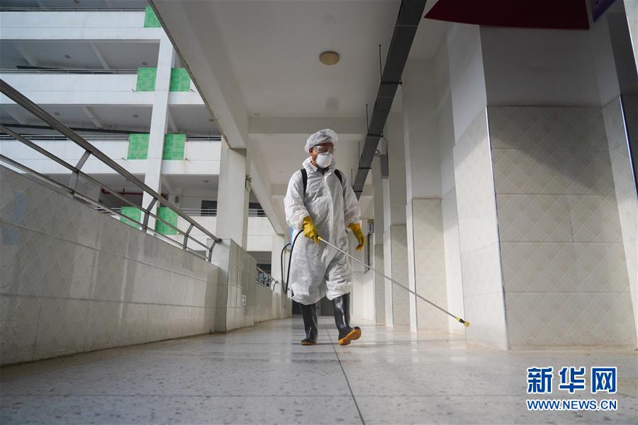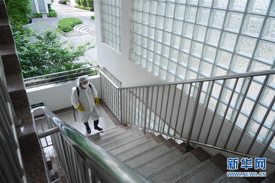 1/05月13日,工作人員在南昌市紅谷灘新區(qū)碟子湖學(xué)校公共區(qū)域進行消殺。(新華社記者 周密/攝)