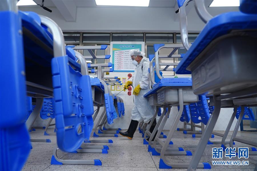 1/05月13日,工作人員在南昌市紅谷灘新區(qū)碟子湖學(xué)校教室進行消殺。5月18日,江西南昌市各小學(xué)、幼兒園即將全面返校(園)。為保障孩子們的健康,當(dāng)?shù)馗餍W(xué)正在進行防疫物資的儲備并進行校園各區(qū)域公共設(shè)施的全面消殺工作。(新華社記者 周密/攝)