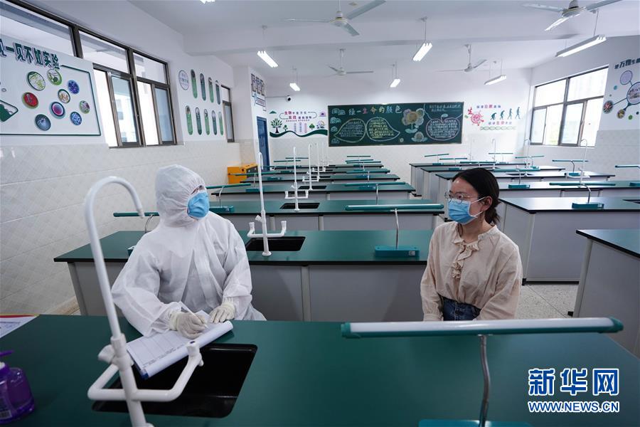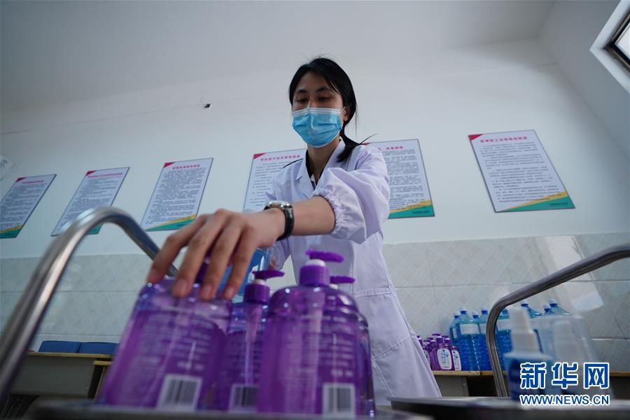 1/05月13日,教師在南昌市紅谷灘新區(qū)碟子湖學(xué)校準(zhǔn)備教室內(nèi)使用的防疫物資。(新華社記者 周密/攝)