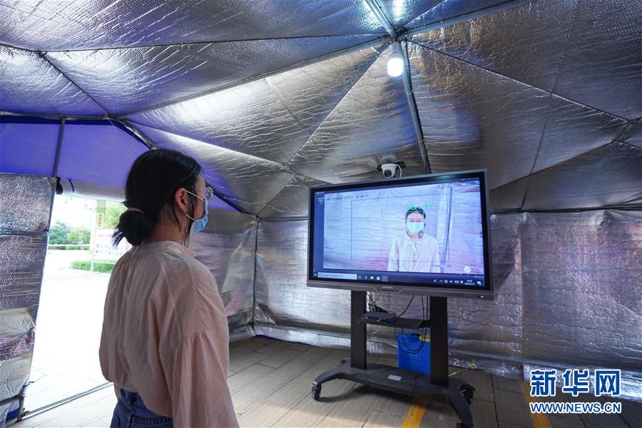 1/05月13日,工作人員在南昌市紅谷灘新區(qū)碟子湖學(xué)校測試體溫監(jiān)控攝像頭。(新華社記者 周密/攝)