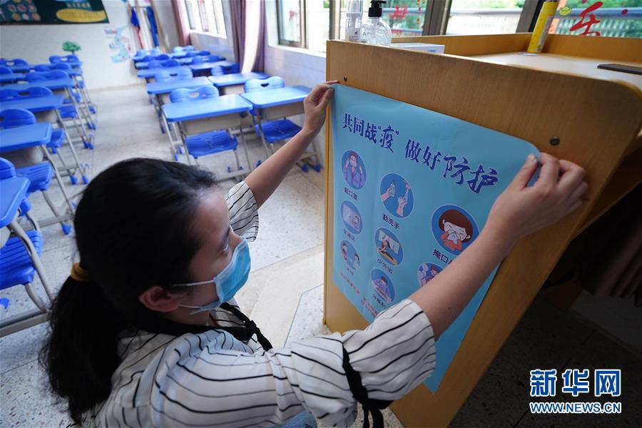 1/05月13日,教師在南昌市紅谷灘新區(qū)碟子湖學(xué)校教室內(nèi)張貼防疫宣傳畫。(新華社記者 周密/攝)