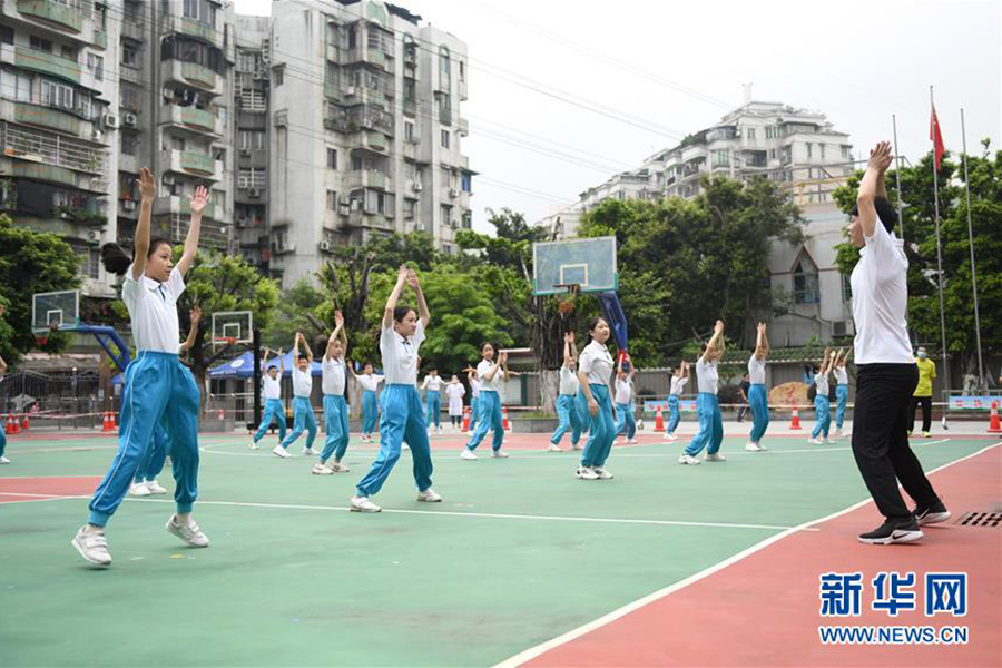 1/05月18日,廣州市荔灣區(qū)林鳳娥小學(xué)五年級(jí)學(xué)生在上體育課。(新華社記者 盧漢欣/攝)