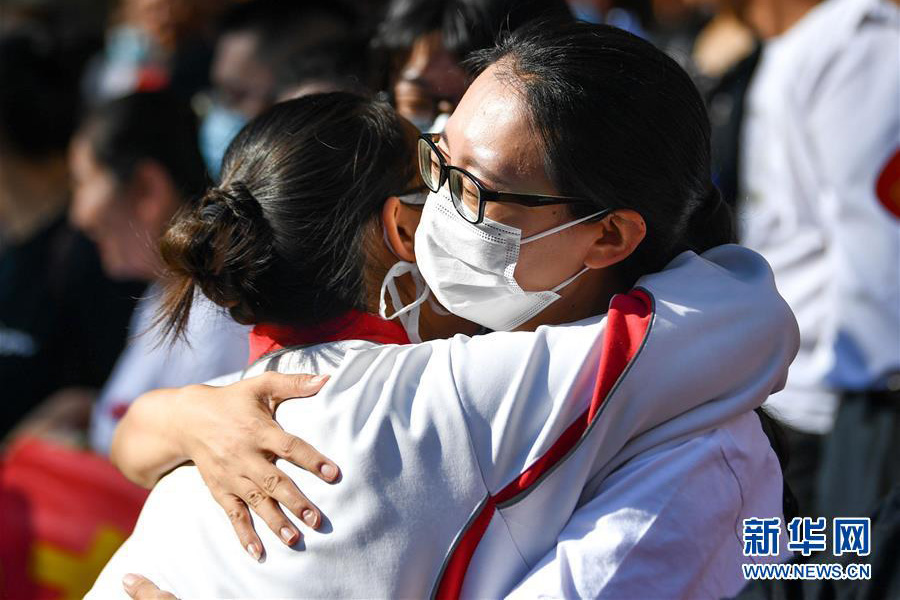 1/07月7日,老師(右)在呼和浩特市第二中學考點外擁抱即將參加高考的考生。(新華社記者 貝赫/攝)