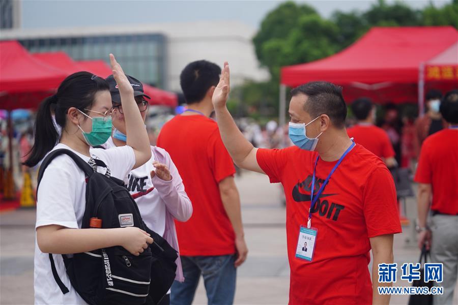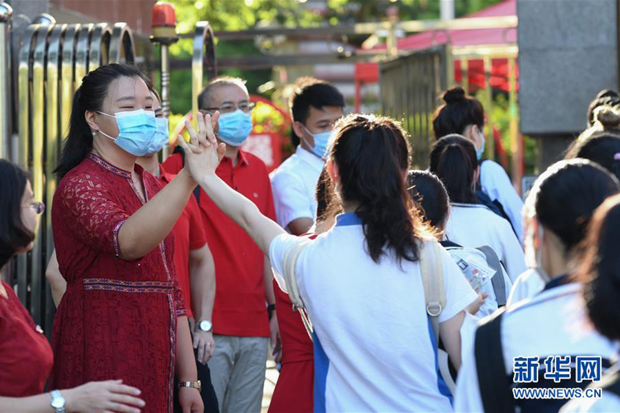 1/07月7日,在南昌二中考點門前,送考老師與考生擊掌。(新華社記者 周密/攝)