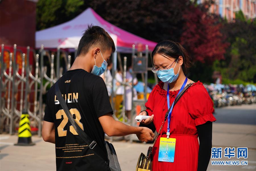 1/07月7日,在河北南宮中學考點外,工作人員為考生測量體溫。(新華社記者 牟宇/攝)