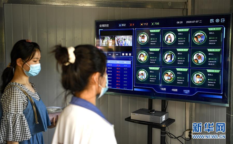 1/07月7日,在貴州省六盤水市第三中學考點,考生在進入考場前檢測體溫。(新華社記者 劉續(xù)/攝)