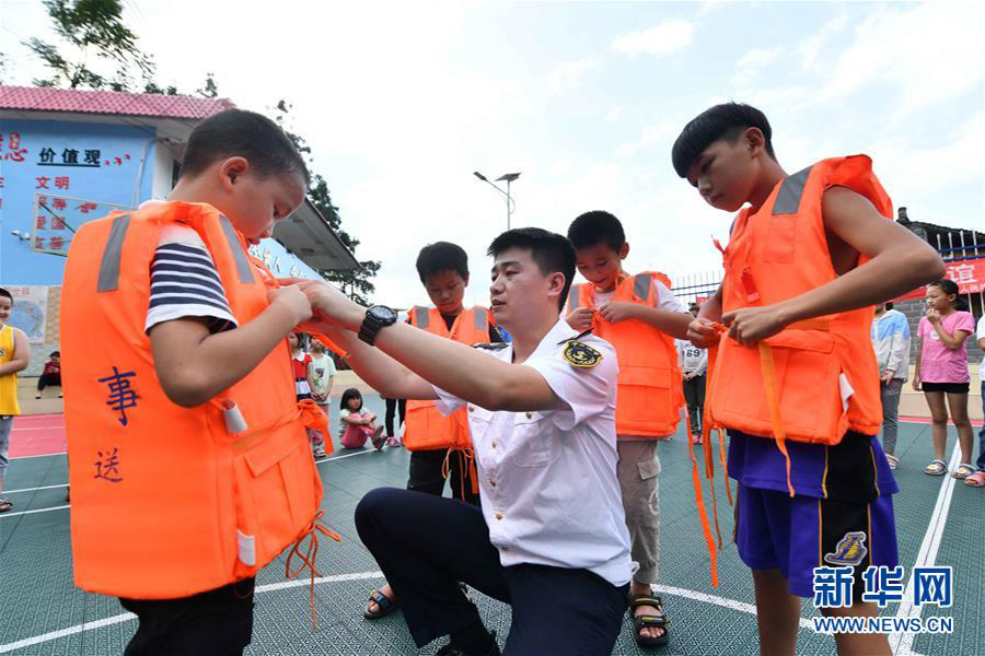 1/07月13日,在廣西融水苗族自治縣桿洞鄉(xiāng)黨鳩小學(xué),融水海事處工作人員指導(dǎo)學(xué)生穿救生衣。當(dāng)日,廣西柳州融水海事處在桿洞鄉(xiāng)黨鳩小學(xué)開展防溺水及水上交通安全知識教育活動,向?qū)W生們普及水上安全知識,并講解水上應(yīng)急救援技能。(新華社記者 黃孝邦/攝)