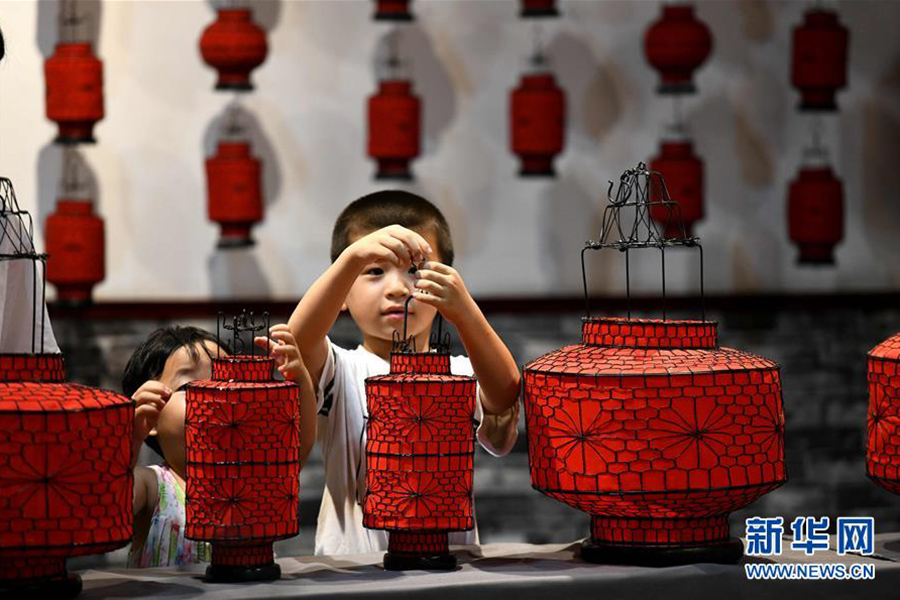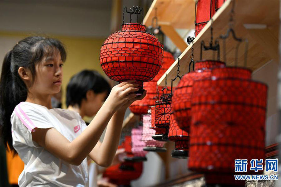 1/08月10日,在石家莊市橋西區(qū),一名學(xué)生在參觀傳統(tǒng)手工藝燈籠。(新華社發(fā) 許建園/攝)