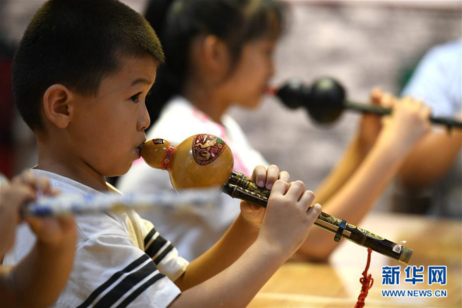 1/08月10日,在石家莊市橋西區(qū),孩子們在練習(xí)吹奏葫蘆絲。(新華社發(fā) 許建園/攝)
