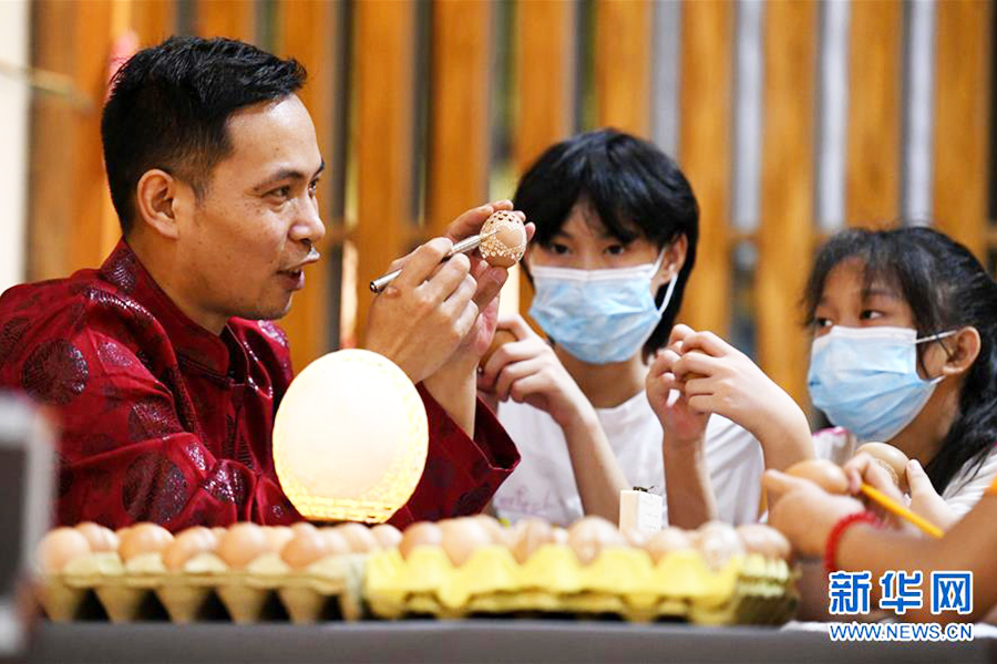 1/08月10日,在石家莊市橋西區(qū),一位民間藝人在指導(dǎo)孩子們學(xué)習(xí)蛋雕技藝。(新華社發(fā) 許建園/攝)