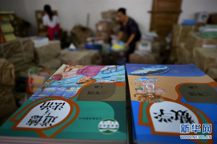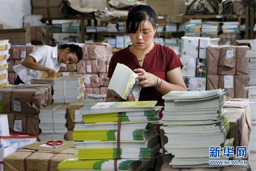 1/08月18日,河北唐山新華書(shū)店遵化分公司的工作人員在清點(diǎn)新學(xué)期教材。(新華社發(fā) 劉滿倉(cāng)/攝)