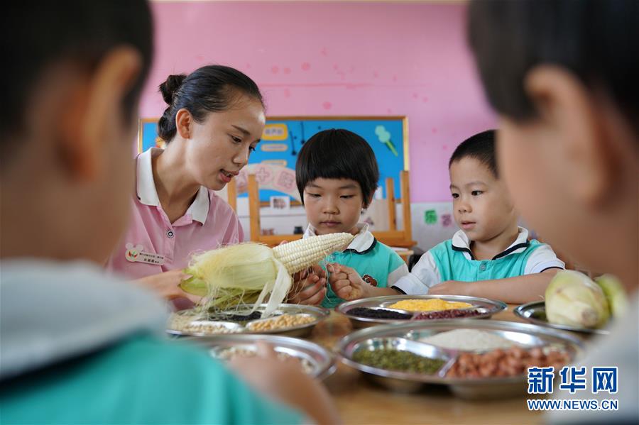 1/09月1日,河北省邢臺市襄都區(qū)第二幼兒園的老師為孩子們講解玉米的構(gòu)造。(新華社記者 牟宇/攝)