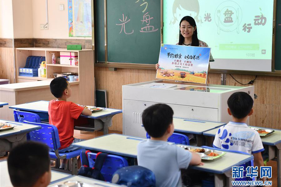 1/09月1日,合肥市翡翠學(xué)校的老師利用午餐前的時間為孩子們上“節(jié)約糧食”第一課。(新華社記者 劉軍喜/攝)