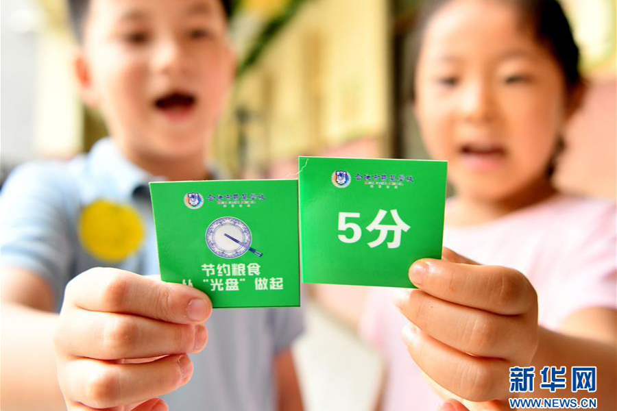 1/09月1日,合肥市翡翠學(xué)校學(xué)生在展示“節(jié)約糧食”獎勵積分卡,積分卡可用來兌換圖書。(新華社記者 劉軍喜/攝)